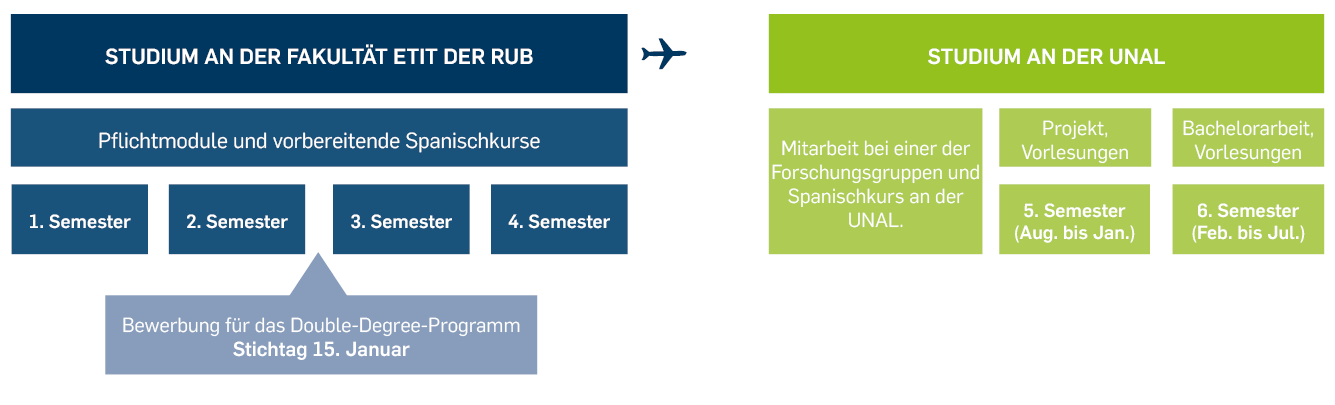 Die ersten vier Semester studierst du Elektrotechnik und Informationstechnik an der RUB, die letzen zwei Semester an der UNAL in Bogotá. In Bochum belegst du die regulären Pflichtmodule und bereitest dich mit Sprachkursen auf den Auslandsaufenthalt vor. Nach dem 2. Semester bewirbst du dich dann für das Double-Degree-Programm. Nach erfolgreicher Bewerbung hast du weitere sieben Monate Zeit, in denen du dich intensiv auf dein Auslandsjahr vorbereitest.