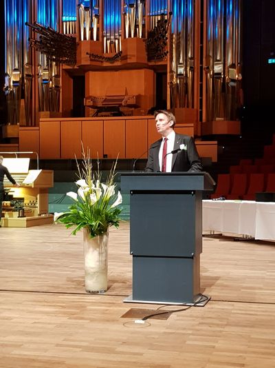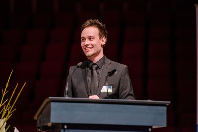 Die Absolventenrede hielt in diesem Jahr Max Hoffmann und präsentierte in seinem Vortrag auf unterhaltsame Art und Weise den Wert des Studiums und referierte über die Arbeitsstunden, die jeder der Absolventinnen und Absolventen in diesen Jahren auf sich genommen hatte. Sein Fazit: besonders an diesem Abend stolz auf sich selbst zu sein. Denn, so schließt der junge Masterabsolvent seine Rede: "Heute Abend sind wir alle Legenden".