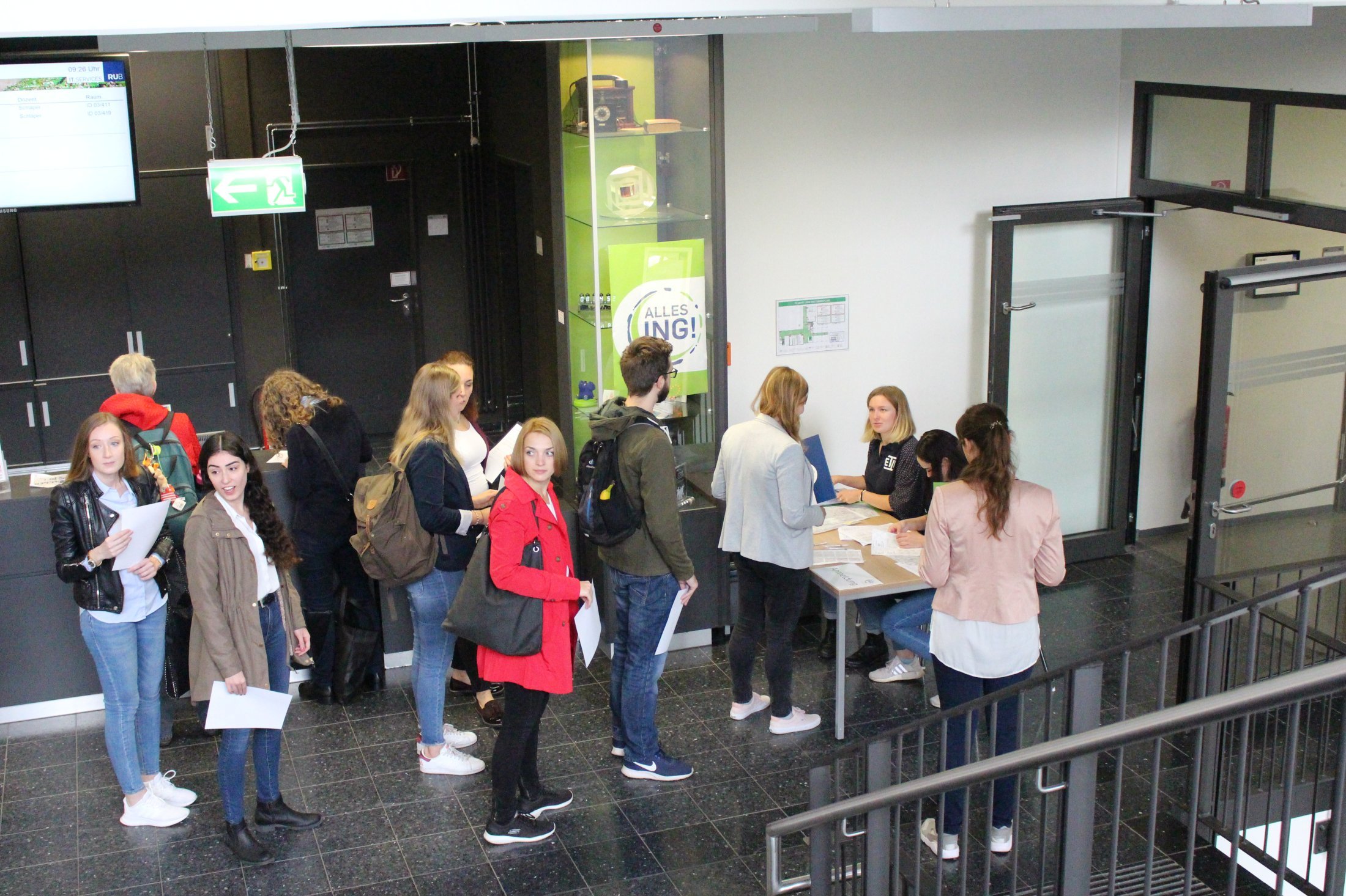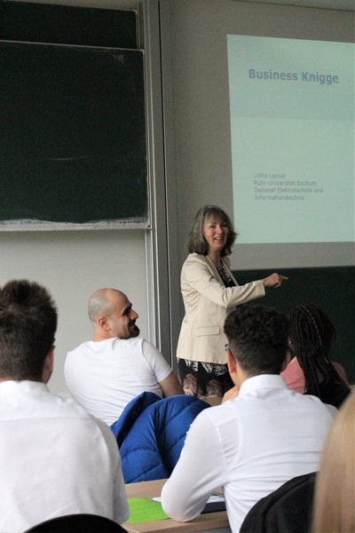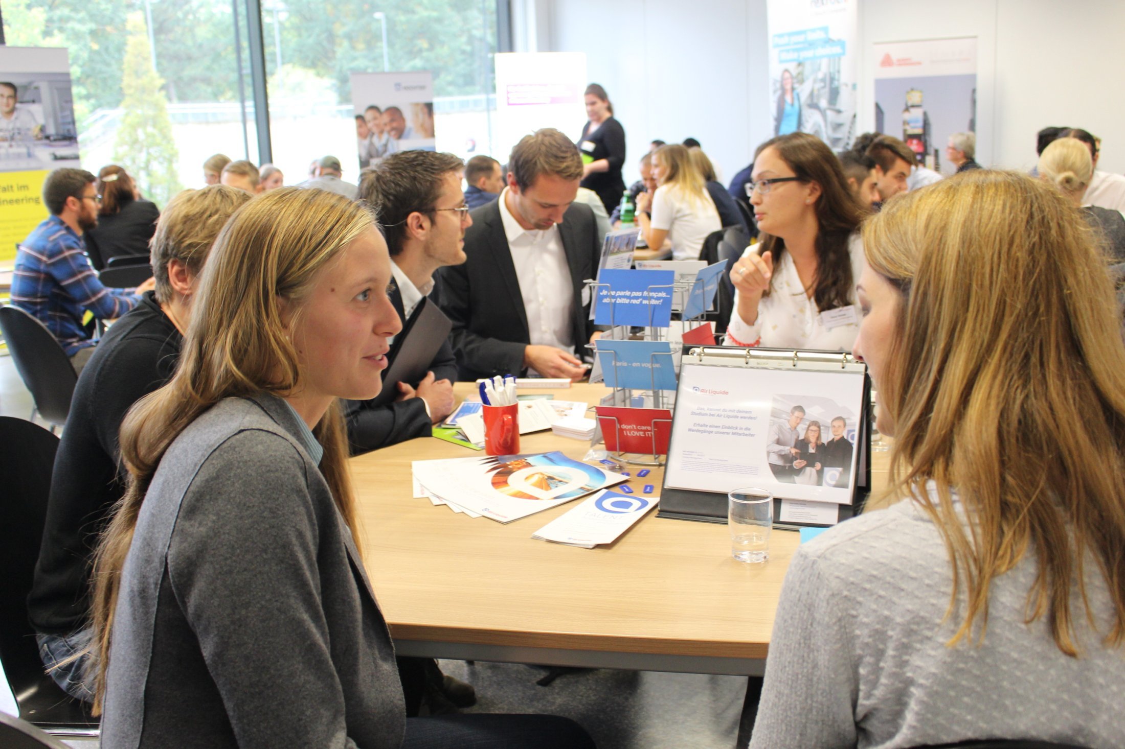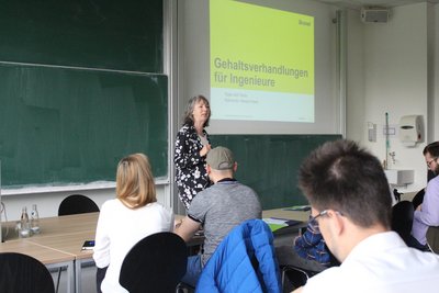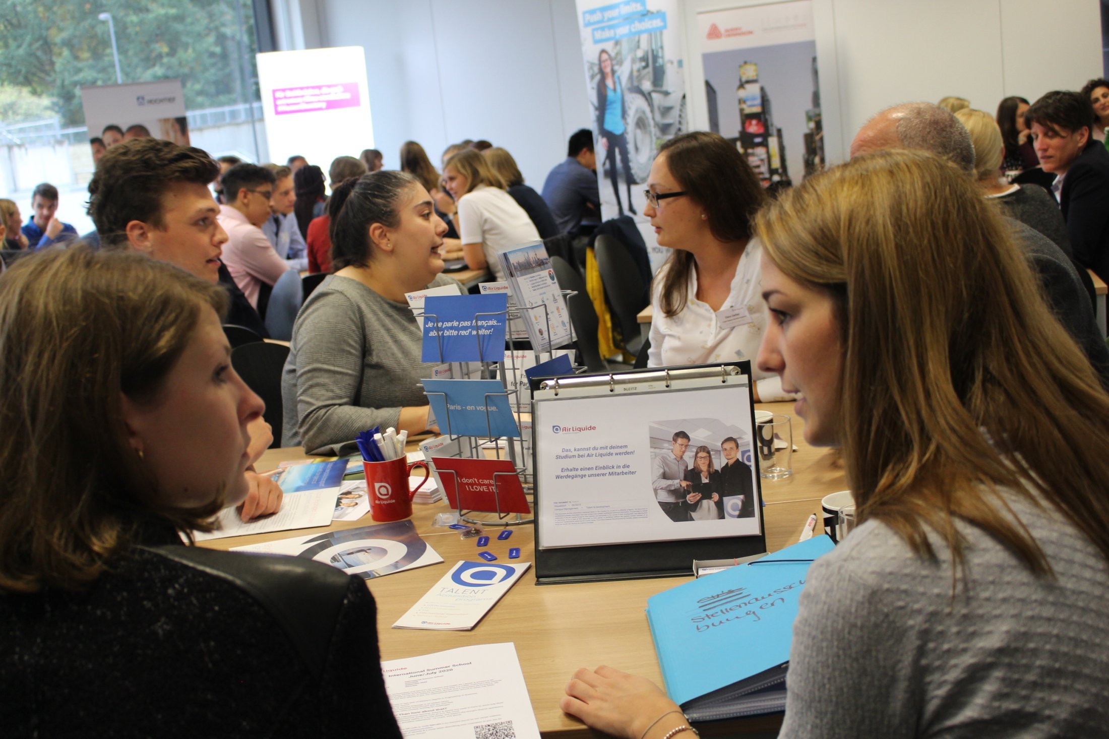 Im Anschluss daran machte Berufsberater Marcus Holzheimer in seinem Vortrag „Richtig Bewerben“ klar, dass nicht immer erst die schriftliche Bewerbung zum Traumjob führt und stellte die Bedeutung von Netzwerken einmal mehr heraus. Zudem beriet er die Teilnehmenden an beiden Tagen ganz individuell, stand Rede und Antwort für allerlei Fragen rund um den richtigen Einstieg ins Berufsleben und nahm sich Zeit für jede einzelne Bewerbung. Um die Vorbereitungen für den zweiten Tag komplett zu machen, konnten sich die Teilnehmenden zusätzlich von Profi-Fotografin Claudia Jaquet ablichten lassen. Neben rhetorischen Tipps und Kniffen, wie man sich Aufmerksamkeit verschafft und diese optimal für sich nutzt, ergab sich für die Teilnehmenden an Tag zwei die Möglichkeit, direkt mit potentiellen Arbeitgebern in Kontakt zu kommen. Die Karriereveranstaltung startete erneut mit einer kurzen Begrüßung, bevor sich Männer und Frauen dann je nach Interesse auf die jeweiligen Vorträge aufteilten. Vertreten waren an diesem Tag die Firmen AIR LIQUIDE, Avery Dennison, Bosch, BP Europa, Brunel, Deilmann-Haniel, Evonic Industrie, die P3 group, das Forschungszentrum Jülich, G-DATA, HOCHTIEF, IBM Security, die IHK Gesellschaft für Informationsverarbeitung, KOSTAL, Schneider Electric, thyssenkrupp, TÜV NORD, VW Infotainment, W3L und Intel. Zudem gab es in diesem Jahr erstmalig einen Beitrag des Worldfactory Start-up Centers der Ruhr-Universität Bochum zum Thema Entrepreneurship.