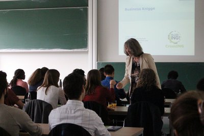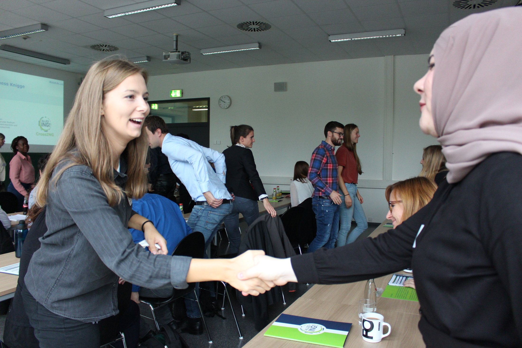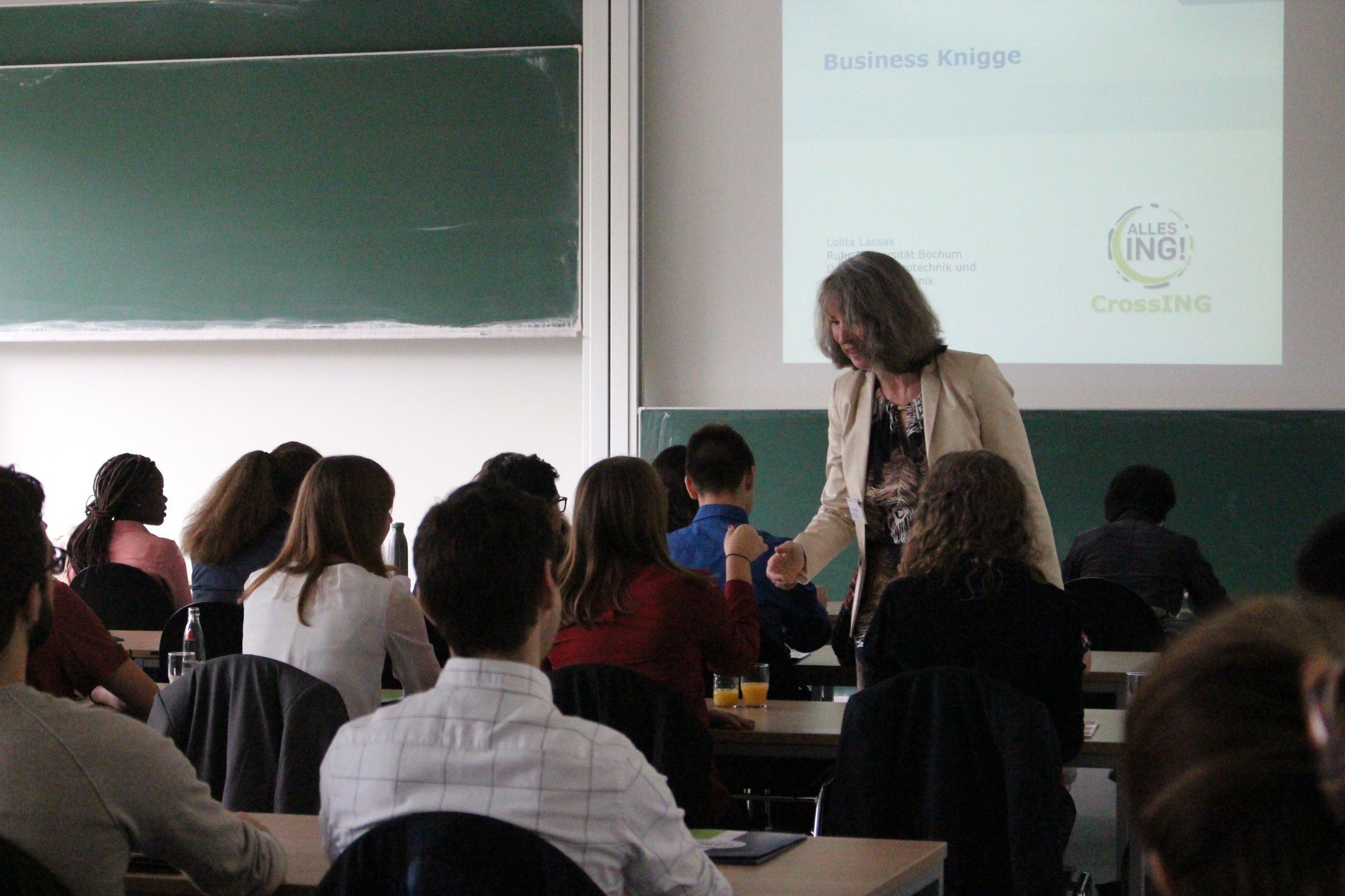 Tag eins startete mit einer besonderen Begrüßung und einem „Business-Knigge“ mit CrossING-Veranstalterin Lolita Lassak, die direkt zu Beginn aufzeigte, auf welchen verschiedenen Wegen ein erster Eindruck entstehen kann. Schaue ich die Person an, die mir gegenübersteht? Halte ich eine Armlänge Abstand bei der Begrüßung? Wie ist meine Körperhaltung? Was sagt meine Mimik? All diese Verhaltensmuster und Höflichkeitsformen wurden an diesem Mittwochmorgen durchgespielt.
