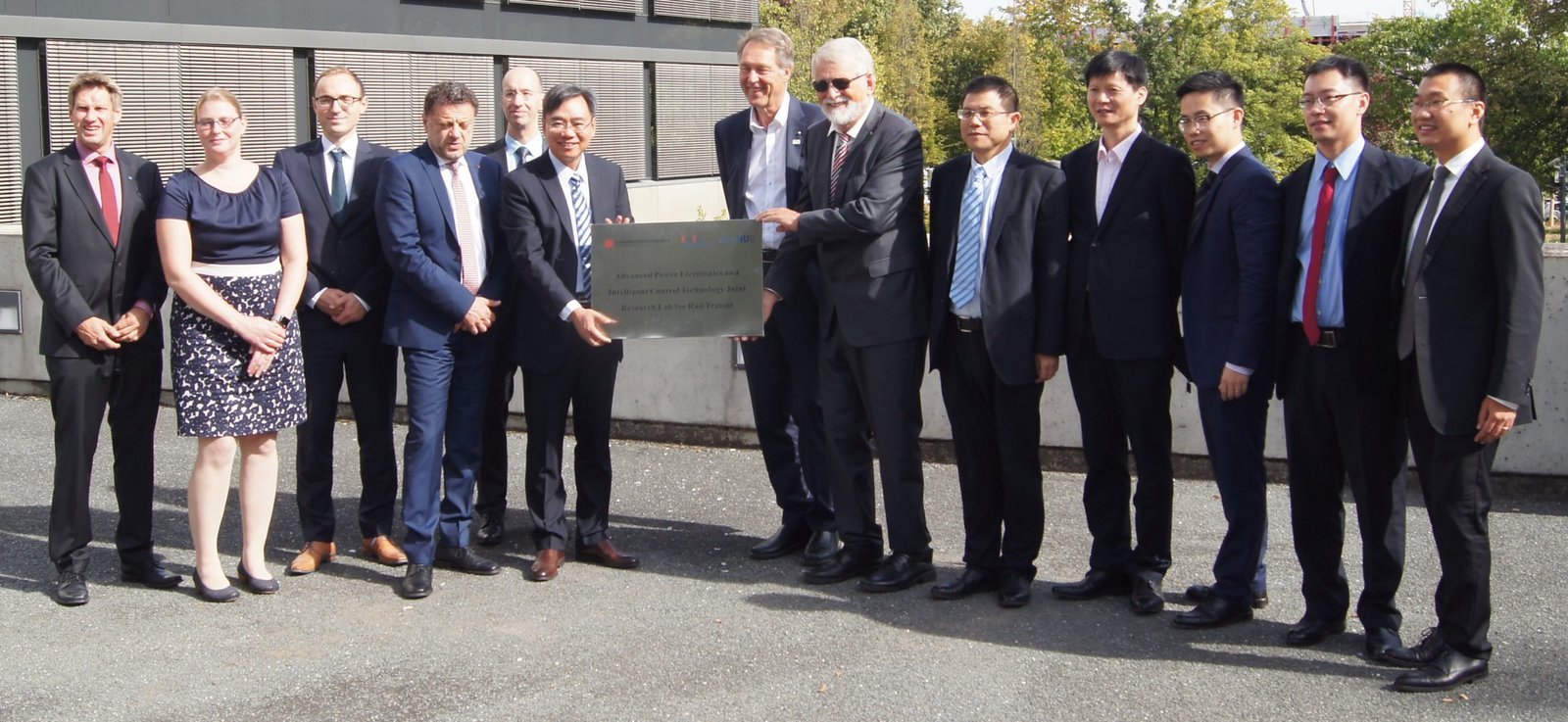 In Anwesenheit des Rektors der Ruhr-Universität Bochum, Prof. Schölmerich, und des Dekans der Fakultät für Elektrotechnik und Informationstechni, Prof. Musch, übergaben Dr. Feng und Dr. Rong von der Firma CRRC-ZIC eine Widmungstafel an Prof. Sourkounis, den Institutsleiter von EneSys. CRRC-ZIC war zu diesem Anlass mit sechs hochrangigen Vertretern angereist, auch um Projekte im Rahmen des Joint Lab vorzubereiten. Über den Kern der Bahntechnologie hinaus werden Projekte im gesamten Umfeld der Elektromobilität im Joint Lab bearbeitet werden. Gemeinsame Forschung und Entwicklung wird dabei die Kompetenz beider Seiten stärken und die Qualität von Forschung und Lehre an der RUB weiter steigern.