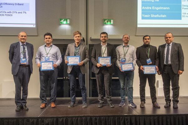 David Starke received a special award. For his paper titled "A Fully Integrated 0.48THz FMCW Radar Transceiver MMIC in a SiGe-Technology", prepared with co-authors Jonathan Wittemeier, Florian Vogelsang, Benedikt Sievert, Daniel Erni, Andreas Rennings, Holger Rücker and Nils Pohl he was awarded as a finalist of the EuMIC 2022 Young Engineer Prize. We congratulate him warmly on this!