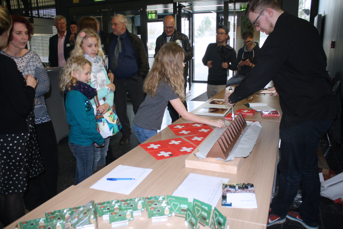 Nach seinem Vortrag zu Energie und Materie überraschte Herr Caspers uns mit einer Spezialität aus seiner jetzigen Heimat, der Schweiz: die Riesen-Toblerone wurde mit Klüpfel und Stechspatel fachgerecht zerlegt und fand reißenden Absatz. Ebenso überraschend war deren Präsentation und die Fest-Musik: Björn Frauendienst von der RUB erfreute Gäste und Veranstalter nicht nur mit original schottischem Dudelsackspiel, sondern auch mit dem ebenso originalen Outfit!