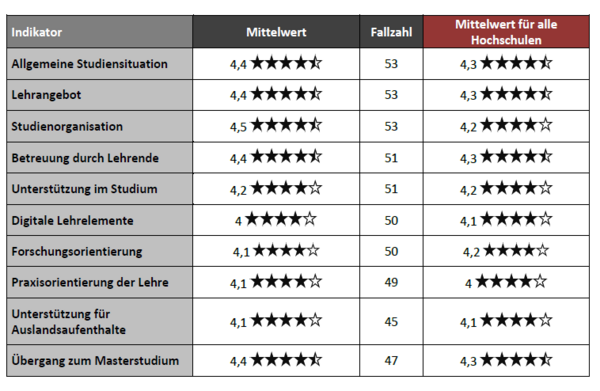 The students particularly praise the general study situation, the teaching offerings, study organization, and the support from lecturers. The faculty also scores consistently high in areas such as study support, research and practical orientation, digital learning elements, support for international stays, and the transition from bachelor’s to master’s studies. The results achieved are predominantly above the national average of comparable universities.