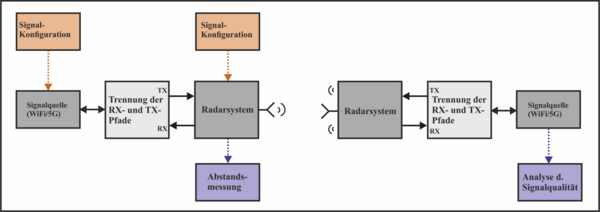 Die Kombination von Kommunikations- und Messsignalen in einem einzigen System ruft jedoch neue Herausforderungen hervor, insbesondere mit Blick auf die Signalsynthese und -verarbeitung, da im JCS-System beide Funktionalitäten mit hinreichender Performanz funktionieren müssen und sich nicht gegenseitig behindern dürfen. Hierfür soll im Rahmen des Projekts 6GEM ein Laborsystem entwickelt und aufgebaut werden, mit dem das Zusammenspiel von Kommunikation und Sensoring erprobt und optimiert werden kann. Gegenwärtig wird hierfür mit WLAN- und 5G-Signalen sowie einem OFDM-Radar gearbeitet.