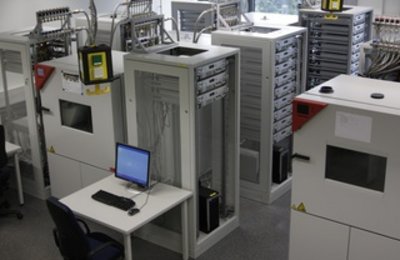 Vor dem Se­ri­en­ein­satz müs­sen die Ei­gen­schaf­ten der Bat­te­rie aus­rei­chend ab­ge­si­chert sein. Ihr Be­triebs­ver­hal­ten für die Bord­netz- und Fahr­stra­te­gie und ihre Al­te­rung für die Le­bens­dau­er­ab­schät­zung sind die we­sent­li­chen Fra­ge­stel­lun­gen. Die For­schungs­grup­pe Kfz-Elek­tro­nik ent­wi­ckelt und pro­du­ziert spe­zi­el­le Test­sys­te­me für diese En­er­gie­spei­cher unter Be­rück­sich­ti­gung der au­to­mo­bi­len Rand­be­din­gun­gen und führt kom­ple­xe Un­ter­su­chun­gen durch. Die Mes­s­er­geb­nis­se lie­fern die Grund­la­ge für eine an­schlie­ßen­de Aus­wer­tung und Mo­dell­bil­dung.