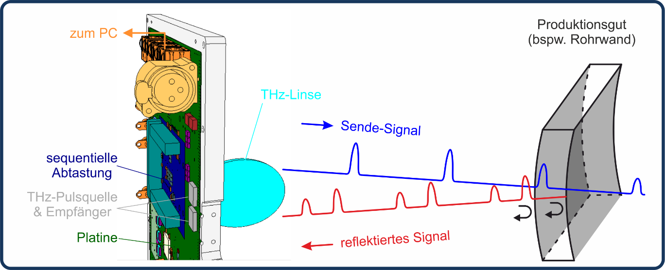 Eine solche Technologie ist die THz-Technologie, welche als In-Line Sensorsystem in der Herstellung von energieintensiven Produkten wie z.B. Kunststoff-Rohren eingesetzt werden kann. Dabei wird die Rohrwanddicke des produzierten Rohrs bereits im Prozess zerstörungsfrei gemessen und auf ein Minimum geregelt. Dies spart enorme Mengen an Energie und Rohmaterial, welches sonst energieintensiv produziert werden müsste. Darüber hinaus kann durch Nachregelung während der Produktion Ausschuss minimiert werden. Der Einsatz von innovativer THz-Technologie mit ihrer hohen Bandbreite und Auflösung ist hier notwendig, weil sehr dünne Rohre, die einen Großteil der typischen Installationsrohre ausmachen, nur mit Systemen mit ausreichender spektraler Bandbreite auflösbar sind. Zudem erfreuen sich Produkte mit dünnen oder gar mehreren Materialschichten wie z.B. Wasserstofftanks oder Platten- und Schaummaterialien großer Beliebtheit und können nur mit entsprechend hochauflösenden THz-Messsystemen abgedeckt werden.