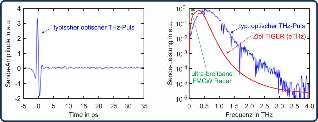 Es sind bereits Vorarbeiten von anderen Gruppen bekannt, die die Machbarkeit von Pulsquellen mit ca. 600 GHz Bandbreite demonstrieren. Hier wurden jedoch nur rudimentäre Ergebnisse von grundlegender Forschung gezeigt, die die Chips mit externen, sehr großen und kostspieligen Laboraufbauten ansteuern. Ihr volles Potenzial sowie eine sehr gute Signalqualität entfaltet die Technologie jedoch erst, wenn sowohl ein Empfangssystem als auch insbesondere die Taktbasis zur Pulserzeugung ebenfalls nach einem geschickten Konzept (wie z.B. Verwendung der sequenziellen Abtastung mit kohärenten Signalquellen) integriert werden.