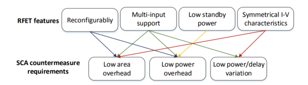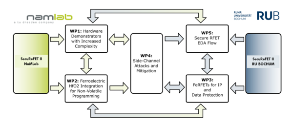 The implementation of hardware protection circuits in CMOS technology is often hampered by cost-inefficiency, primarily due to excessive power dissipation and large silicon area requirements. Re-configurable Field-Effect Transistors (RFETs) can be reversibly reconfigured into p-type and n-type operating modes, offering the functionality of two different devices into one. With advantages such as run-time reconfiguration, symmetric I-V characteristics, multi-Vt designs, low-standby power, multi-independent gate support, inherently polymorphic functionality, RFETs make a promising solution for mitigating hardware attacks. In SecuReFET - phase I, the use of the runtime reconfigurability of these nano electronic components for polymorphic logic gates for circuit obfuscation was demonstrated in the laboratory. The potential of RFETs with respect to side-channel resistance and the provision of targeted security functions, as well as potential new security vulnerabilities of RFETs, was investigated. An RFET-compatible automated design synthesis (EDA) environment for logical and physical design has been developed. Phase II is dedicated to exploring all these topics in greater depth. First, laboratory demonstrators consisting of multiple logic gates connected through an additional metal layer will be fabricated and electrically characterized. Next, a ferroelectric layer will be integrated into the RFETs to enable non-volatile storage of the key directly within the device. This approach eliminates the vulnerable interface between memory and logic, preventing potential attacks. Ideally, the transistor’s function can be programmed immediately after custom manufacturing and remains inaccessible from the outside. Such a concept could address one of the fundamental challenges in hardware security by making the connection between memory and locking circuitry unassailable. Furthermore, the unique characteristics of RFETs with respect to side-channel attacks will be systematically explored, opening new opportunities for more effective protection against diverse attack scenarios while reducing both area and power consumption. Unlike existing countermeasures that focus primarily on safeguarding data, RFET-based polymorphic cells also provide a means to protect intellectual property (IP) from side-channel vulnerabilities. We therefore investigate how RFET features (both in volatile and non-volatile configurations) can be leveraged to secure IP and data against threats such as propagation delay analysis or power leakage. Finally, the proposed security solutions, combining ferroelectric memory with enhanced side-channel resilience, will be integrated into the EDA synthesis flow established in SecuReFET-I.