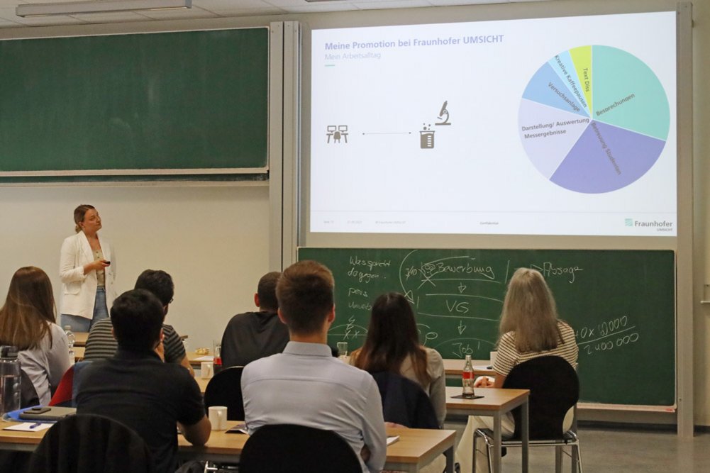 Dr.-Ing. Dennis Michaelis, CEO und Co-Founder von GEMESYS und ETIT-Alumnus, berichtete von seinen bisherigen Erfolgen als Start-Up-Gründer und betonte, wie wichtig es ist, die richtigen Mitstreiter*innen an seiner Seite zu wissen. Francesca Schenkel vom Lehrstuhl für Hochfrequenztechnik verdeutlichte die Rolle der Wissenschaft bei der Erfüllung der 17 globalen Ziele für nachhaltige Entwicklung der Agenda 2030 und betonte, dass auch vermeintlich kleine Beiträge das große Ganze unterstützen.