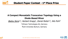 Unser Doktorand Badou Sene hat bei der Virtual Conference der IEEE Radio & Wireless Week den ersten Platz im Student Paper Contest gewonnen. Sein Beitrag trägt den Titel "A Compact Monostatic Transceiver Topology Using a Diode-Based Mixer". Herr Sene arbeitet in seiner Promotion als externer Doktorand bei Infineon Technologies in Kooperation mit dem Lehrstuhl für Integrierte Systeme. Wir freuen uns sehr mit ihm und gratulieren zu dem tollen Erfolg!