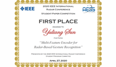 Unser Doktorand Yuliang Sun wird auf der 2020 IEEE International Radar Conference mit dem 1. Platz bei der Student Paper Competition geehrt. Gewürdigt wird er für seine Arbeiten zum Thema "Multi Feature Encoder for Radar Based Gesture Recognition", die in Zusammenarbeit mit der Firma Hella stattfinden. Wir gratulieren Yuliang sehr zu seinem Erfolg!