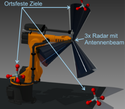 Industrieroboter hochpräzise und dennoch kostengünstig einsetzen zu können, das ist das Ziel des Forschungsprojekts Radarmeter-3D. Industrieroboter weisen eine meist sehr gute relative Positionsgenauigkeit auf. Das Erreichen einer hochpräzisen und belastungsunabhängigen absoluten Positionsgenauigkeit ist jedoch ein bisher nicht zufriedenstellend gelöstes Problem. Optische Sensorverfahren zur Positionsregelung sind empfindlich gegen Staub und Feuchtigkeit. Darüber hinaus sind die Sensoren entweder unpräzise, langsam und günstig, wie kamerabasierte Verfahren, oder präzise und schnell dafür aber teuer, wie z.B. laserbasierte Systeme.