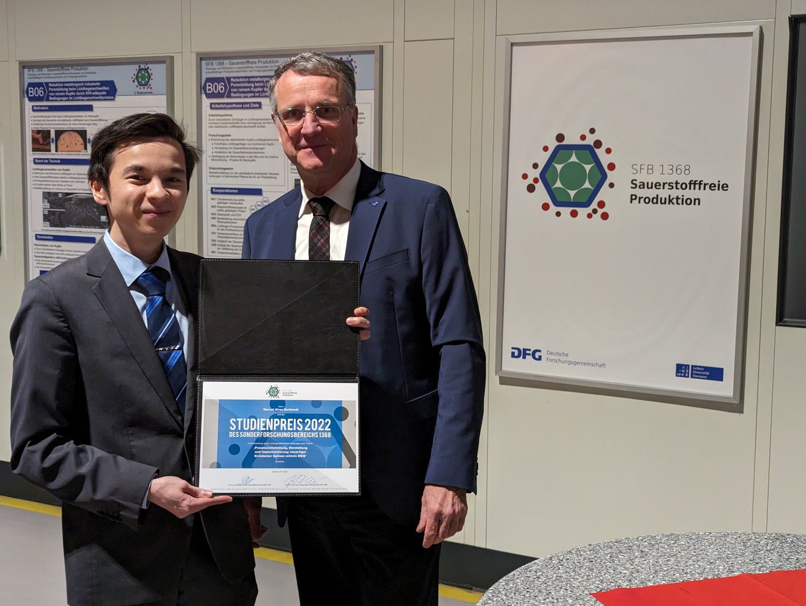 Am 06. Dezember 2023 fand im Rahmen der Mitgliederversammlung des SFB 1368 in Garbsen am Produktionstechnischen Zentrum der Leibniz Universität Hannover die Verleihung des Studienpreises 2022 statt. Insgesamt wurden zwei Wissenschaftler für außergewöhnliche Leistungen ihrer Abschlussarbeiten in diesem Bereich ausgezeichnet.