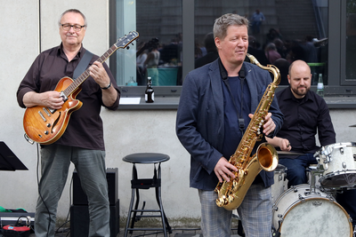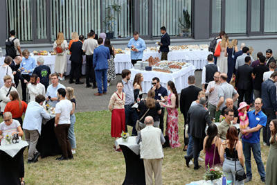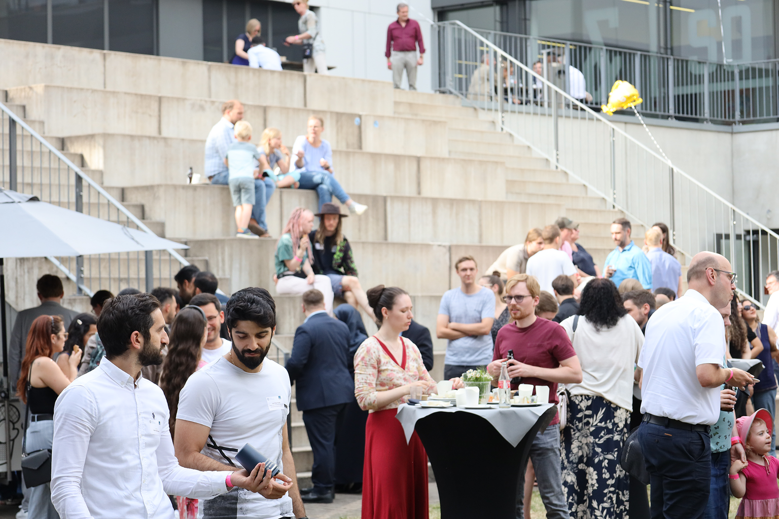 Nach den Vorträgen und dem Festakt fanden die Gäste, Mitarbeitenden der Fakultät und Professor*innen im Innenhof wieder zusammen und ließen den Sommerabend bei kalten Getränken, Snacks und Eis ausklingen. Musikalisch wurden sie dabei von der Band Memphis PC begleitet.