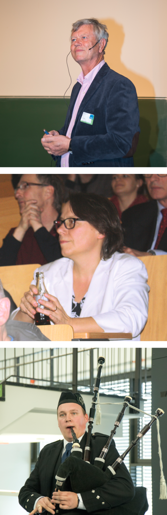 Nach seinem Vortrag zu Energie und Materie überraschte Herr Caspers uns mit einer Spezialität aus seiner jetzigen Heimat, der Schweiz: die Riesen-Toblerone wurde mit Klüpfel und Stechspatel fachgerecht zerlegt und fand reißenden Absatz. Ebenso überraschend war deren Präsentation und die Fest-Musik: Björn Frauendienst von der RUB erfreute Gäste und Veranstalter nicht nur mit original schottischem Dudelsackspiel, sondern auch mit dem ebenso originalen Outfit!