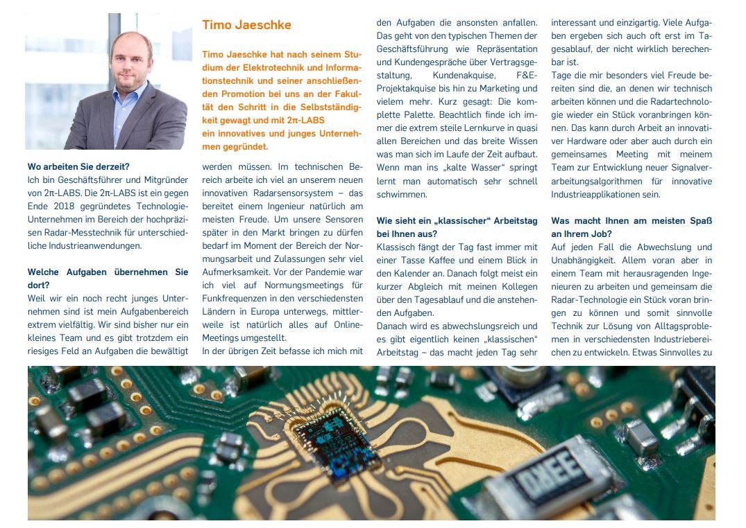 Ein weiteres Highlight: einige unserer Alumni berichten in Interviews von ihren ganz individuellen Karrierewegen und Jobmöglichkeiten nach dem Studium. Denn die Berufsfelder, in denen sich Absolvent:innen der Elektrotechnik und Informationstechnik sowie der IT-Sicherheit bewegen, sind vielfältig. Ob Start-up-Gründer:in, Manager:in im Unternehmen oder Karrierewege in der Forschung - alles ist möglich. Um die hervorragenden Entwicklungs- und Zukunftsperspektiven, aber auch die Vielfalt des Ingenieurberufs zu zeigen, haben wir einige unserer Absolvent:innen gebeten, in einem Interview Fragen zu Ihrem Joballtag zu beantworten. Nicht zuletzt durch Einblicke wie diese zeigt die Fakultät ETIT, was das ID-Gebäude und die Menschen darin ausmacht. Zudem erzählt die Fachschaft, wie der Studienalltag an der Fakultät ETIT aussehen kann.