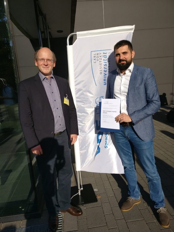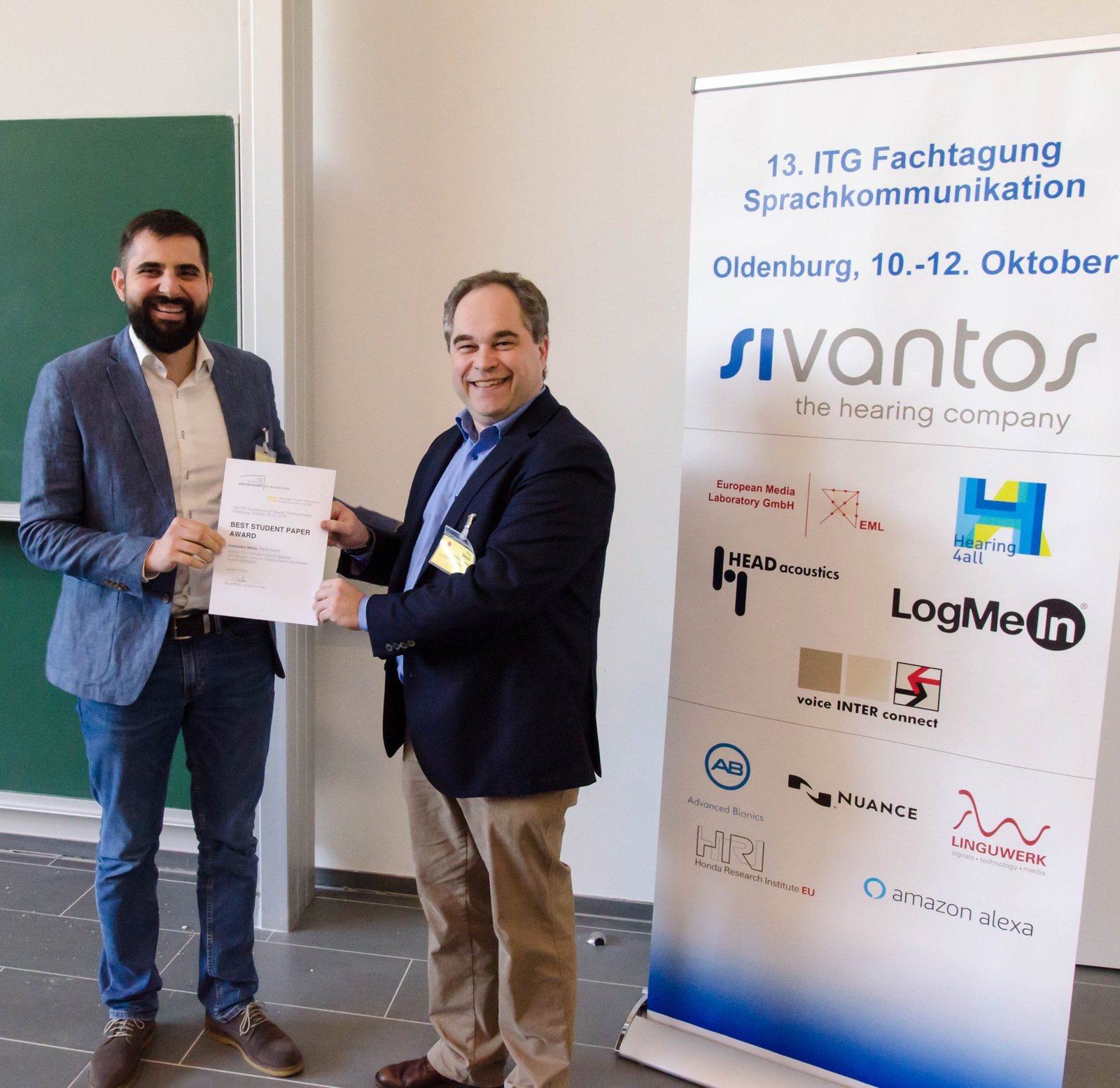 Alexandru Nelus and Rainer Martin both from the Institute of Communication Acoustics have been awarded the Best Student Paper Award for their paper "Gender Discrimination Versus Speaker Identification Through Privacy-Aware Adversarial Feature Extraction" at the 13. ITG Fachtagung Sprachkommunikation in Oldenburg on 10.-12. Oktober 2018.