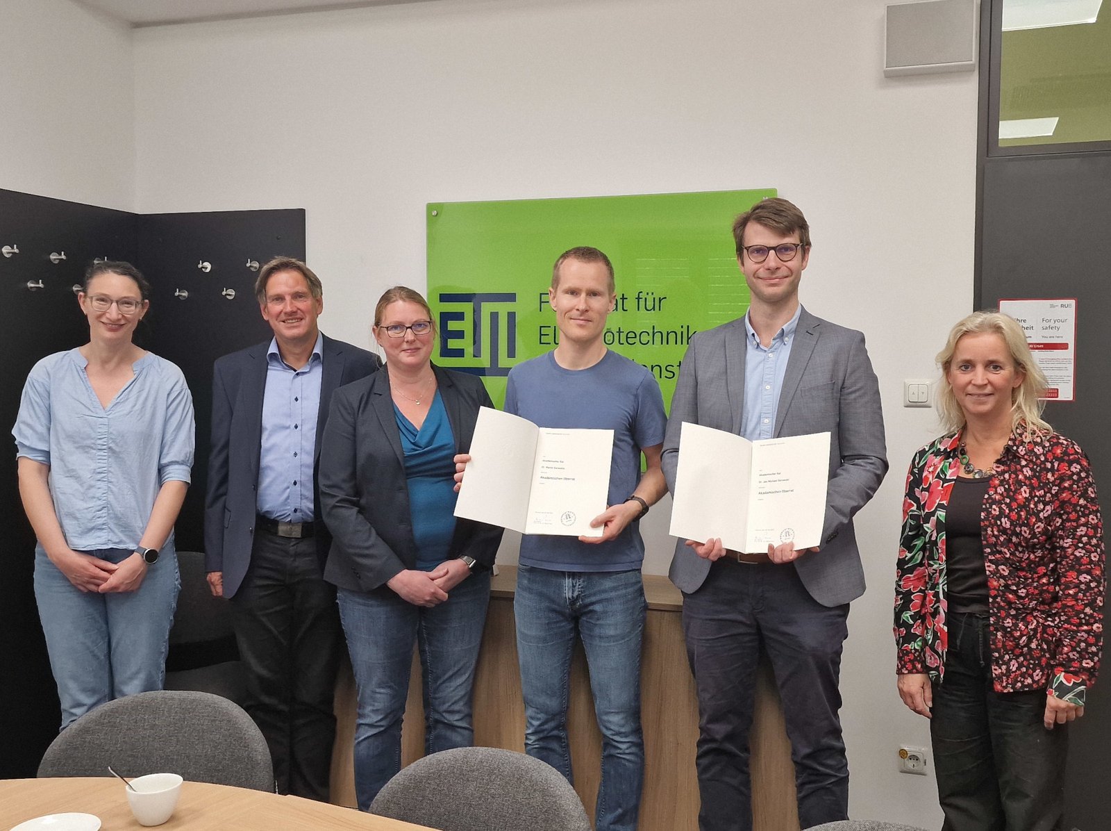 Die Ehrung fand im Dekanat der Fakultät statt. Von links: Prof. Dr. Clara Saraceno, Dekan Prof. Dr. Thomas Musch, Geschäftsführerin Dr. Corinna Heldt, Dr. Martin Saraceno, Dr.-Ing. Jan Barowski und Lehrstuhlinhaberin Prof. Dr.-Ing. Ilona Rolfes.