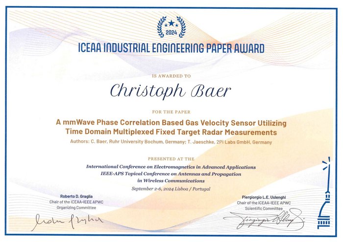 Gemeinsam mit Dr. Timo Jaeschke von 2-Pi Labs präsentierte Dr. Baer das Paper mit dem Titel "A mmWave Phase Correlation Based Gas Velocity Sensor Utilizing Time Domain Multiplexed Fixed Target Radar Measurements." Die Arbeit stellt einen innovativen Sensor zur berührungslosen Messung der Gasgeschwindigkeit vor, der auf modernster Millimeterwellen-Radar (mmWave) Technologie basiert. Die Messmethode nutzt ein Netzwerk von dielektrischen Wellenleitern, um die Permittivität eines fließenden Gases an mehreren Stellen eines Rohrs mithilfe sehr schneller Radarmessungen zu bestimmen. Durch die Korrelation der jeweiligen Messreihen der Einzelmessstellen lässt sich die Geschwindigkeit des Gasflusses präzise ermitteln. Diese vorgestellte Technologie ist insbesondere in sicherheitsrelevanten Anlagen, z.B. in Explosionsgefährdeten Bereichen von großer Relevanz.