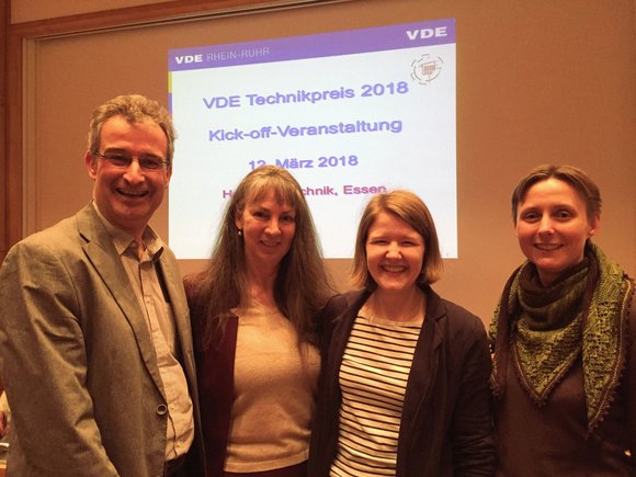Beim Kickoff für den VDE-Rhein-Ruhr-Technikpreis 2018 trafen sich am Montagabend, 12. März, Veranstalter und Schülerinnen und Schüler von insgesamt zehn verschiedenen Schulen aus der Region, um im Haus der Technik in Essen ihre Wettbewerbskonzepte vorzustellen. Hartmut Fiege, Vorsitzender der VDE Rhein-Ruhr, begrüßte gegen 18 Uhr die Gäste des Abends, unter anderem auch die Alumni-Beauftragte Lolita Lassak (2.v.l. im Bild) und Studienberaterin Katharina Sendlinger (2.v.r.) von der Fakultät für Elektrotechnik und Informationstechnik. Eingeladen hatte Alumnus Andreas Hösle (l.) vom VDE, der auch den Kontakt zur zdi-Netzwerk-Beauftragten Dr. Raphaela Meißner (r.) seit Jahren pflegt und die Kooperation von Schule und Uni unterstützt. Ein durchweg positives Zeichen für die gemeinsame Zusammenarbeit von Fakultät und Alumni. Durch das tolle Engagement von Andreas Hösle als Alumnus der Ruhr-Universität Bochum konnte auch an diesem Abend wieder die Brücke zwischen Schule und Hochschulbildung geschlagen werden. Die Schülerinnen und Schüler, die bereits durch eine Vorauswahl als Wettbewerber ermittelt wurden, präsentierten Themen wie etwa das Maristometer (ein Vielfachmessgerät für den Unterricht) oder einen Saftikus (ein innovativer, fortgeschrittener und gesunder Cocktailmixer). Während das Gymnasium Petrinum aus Dorsten ihr Energieautarkes Haus vorstellte, versuchte das Berufskolleg Ostvest mit ihrem Projekt Autonomes Fahren mit Computer-Vision bei der Jury zu punkten. Das Andreas-Vesalius-Gymnasium aus Wesel brachte ihre Idee zur Arduino-Smartwatch mit Notruffunktion vor und bei der Projektvorstellung der Willy-Brandt-Schule drehte sich alles um eine autarke E-Bike Ladestation. Thematisch ähnlich aufgestellt zeigte sich das Hittorf Gymnasium mit ihrer Idee zum induktiven Laden eines Akkus für E-Fahrzeuge. Und ums Fahrzeug ging es auch beim Pascal-Gymnasium aus Münster. Sie stellten ihre Idee zum Pascal-Klima-Netzwerk für die Fahrradstadt Münster vor. Das Adalbert-Stifter-Gymnasium hingegen stellte ihre Idee zum Schachroboter vor, während das Schiller Gymnasium im Wettkampf um den Technikpreis 2018 auf autonome Roboter setzte. Für die weitere Auswahl ist nun ein Treffen am 3. Juli (Willy-Brandt-Schule, Mülheim a.R., http://www.wbs-mh.de/ ) geplant. Dort wird dann die Umsetzung aller Projekte erneut begutachtet und es werden die drei besten ausgewählt, um sich den Titel für den VDE-Technikpreis 2018 zu holen. Weitere Infos zum VDE Rhein-Ruhr gibt es unter https://www.vde-rhein-ruhr.de/de/ueber-uns/preise-ehrungen/technikpreis/technikpreis-2018.