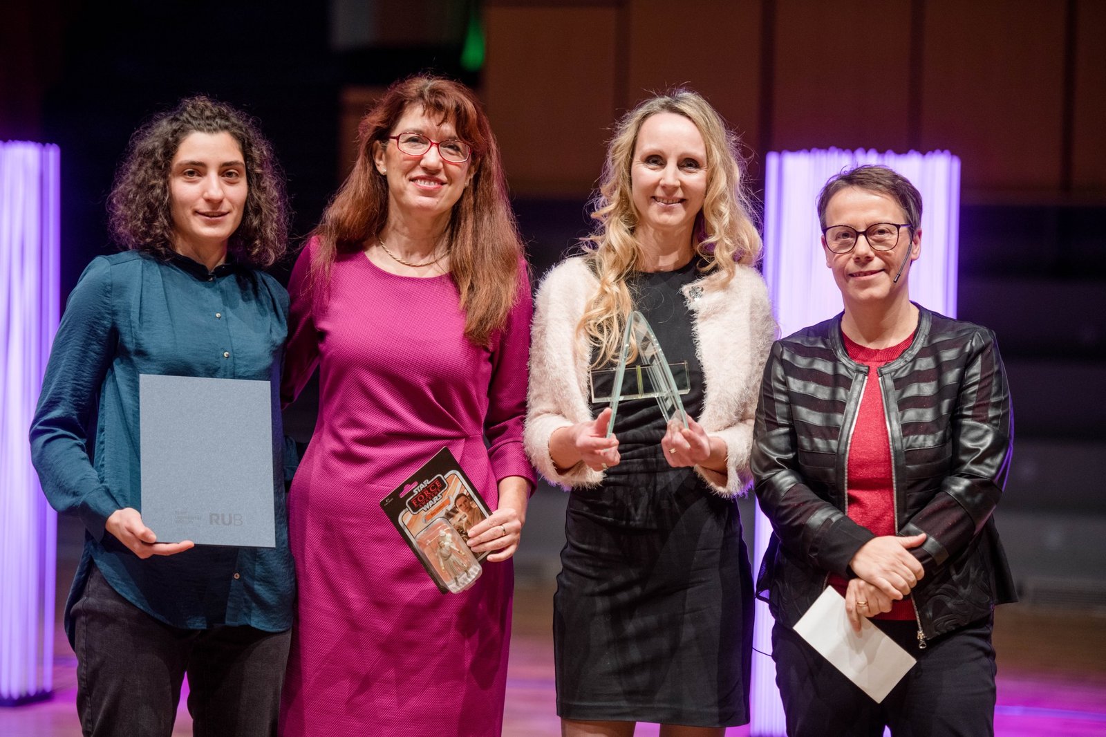 Er ging diesmal an die Fakultät für Elektrotechnik und Informationstechnik und deren Gleichstellungsoffensive „Wir machen uns stark“. Kanzlerin Dr. Christina Reinhardt überreichte den Preis – zuzüglich einer Figur der Star-Wars-Heldin Rey – an Nadine Müller, Biljana Cubaleska und Zehra Karadag (von rechts) aus dem dezentralen Gleichstellungsbüro der Fakultät. Den Film zum Projekt gibt's auf dem Youtube-Kanal der Fakultät unter https://www.youtube.com/watch?v=ChPzAfNP3QE. (Foto: RUB/Marquard)