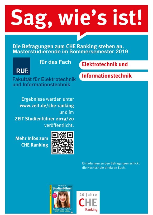 Und macht mit bei der Befragung zum CHE Ranking für alle Masterstudierende im Sommersemester 2019 für das Fach Elektrotechnik und Informationstechnik. Die Ergebnisse werden regelmäßig unter www.zeit.de/che-ranking und im ZEIT Studienführer 2019/20 veröffentlicht. Teilt eure Meinung und gebt eure Stimme ab. Infos findet ihr im Anhang und unter http://www.che-ranking.de/cms/?getObject=2&getLang=de. Einladungen zu den Befragungen schickt die Hochschule direkt an euch.