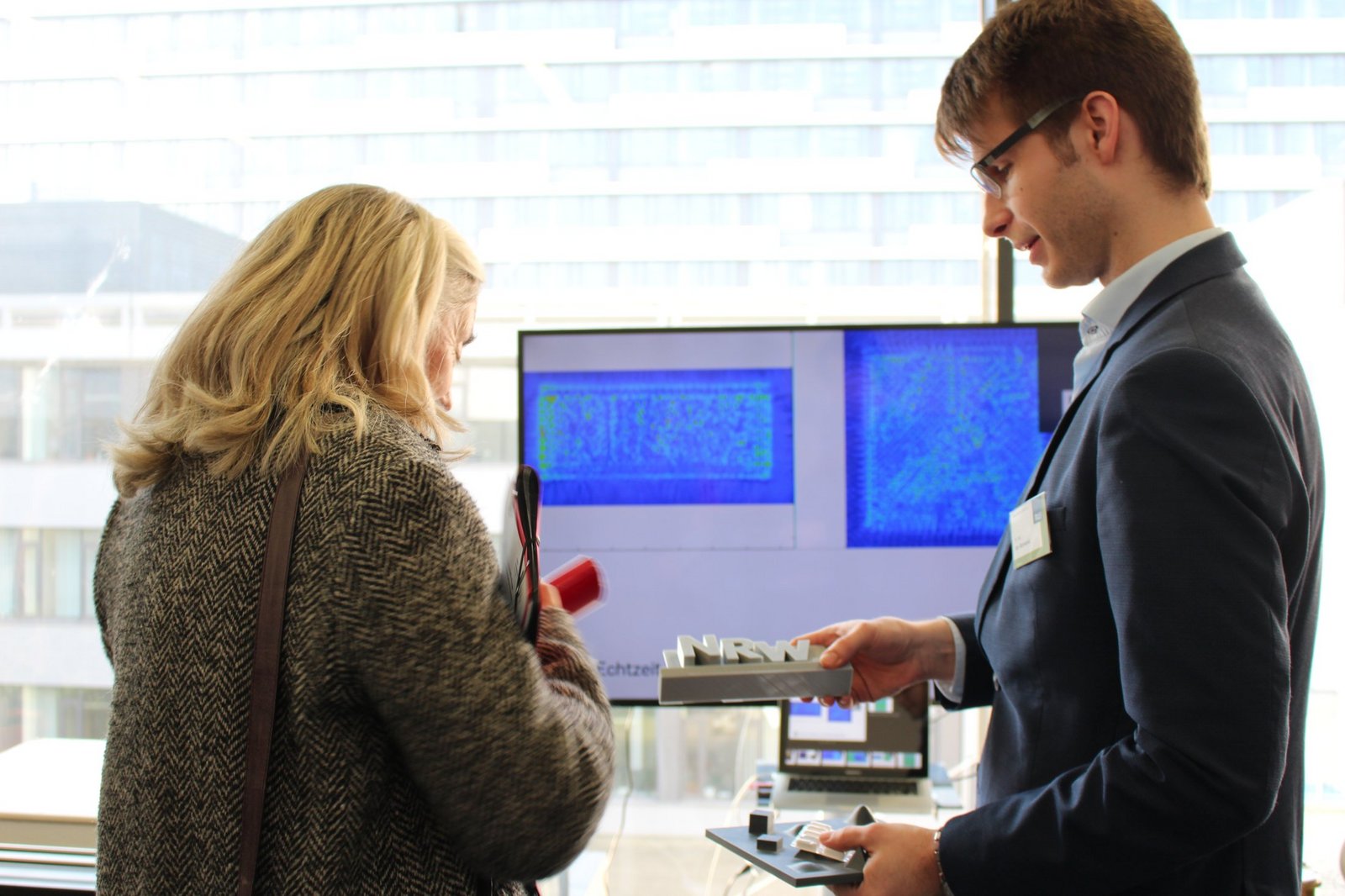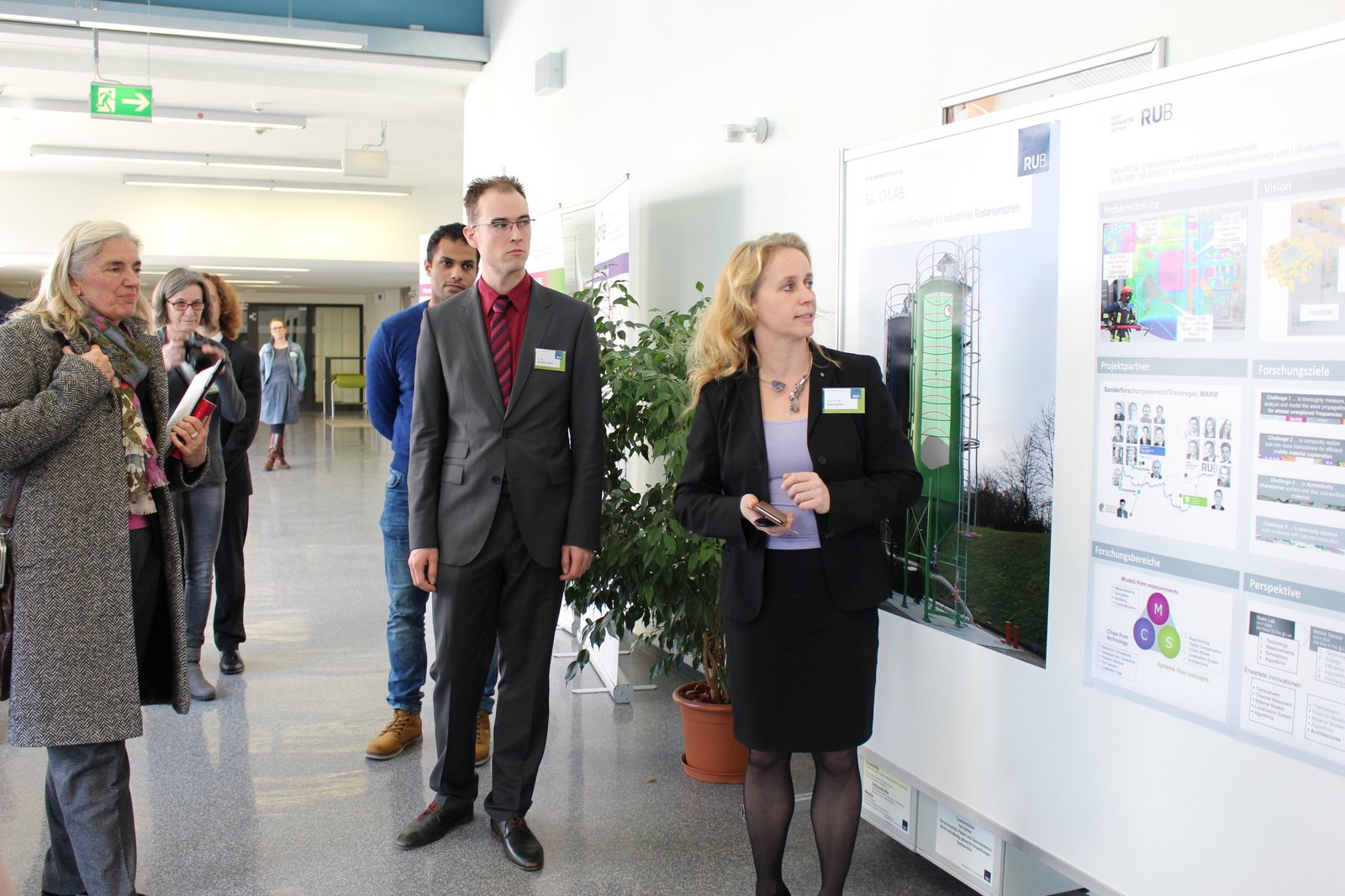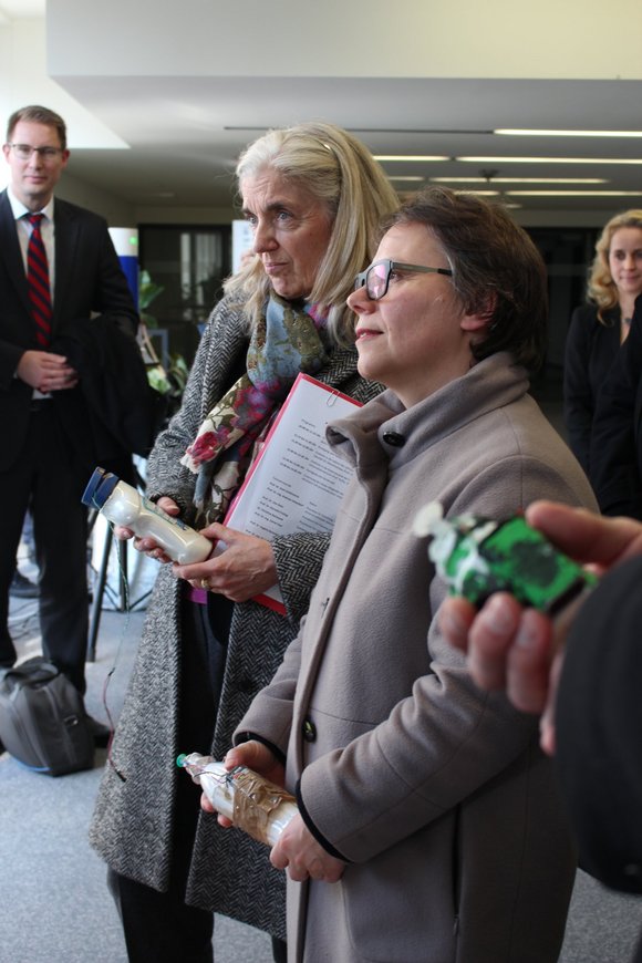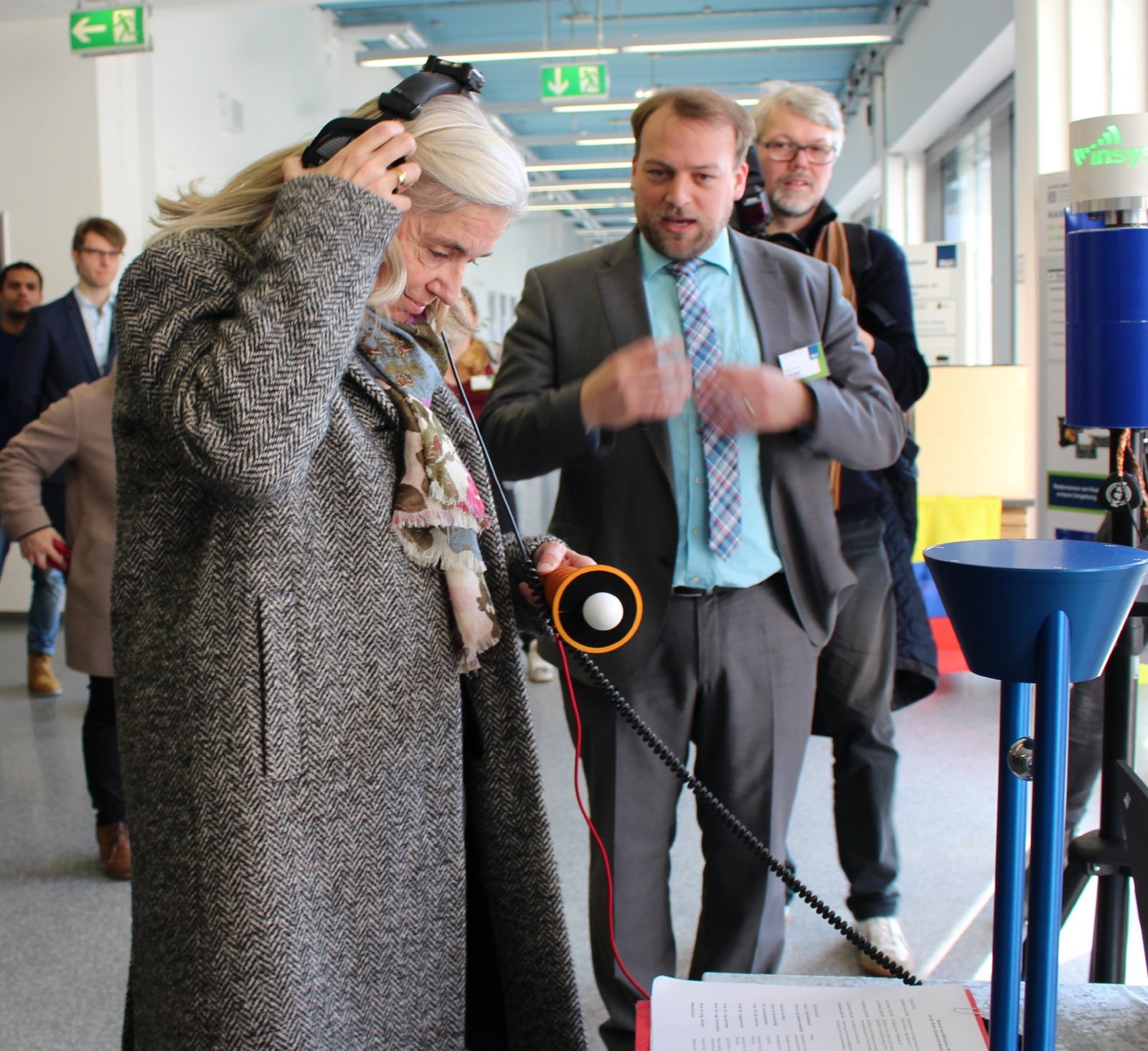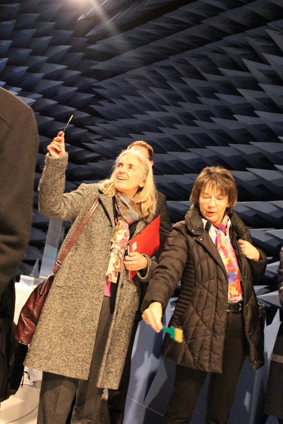 Am heutigen Mittwochmittag, 7. Februar, besuchte Kultur- und Wissenschaftsministerin Isabel Pfeiffer-Poensgen die Fakultät für Elektrotechnik und Informationstechnik. Während der Führung durch das ID-Gebäude legte die NRW-Ministerin bei einigen Experimentalaufbauten aus den Lehrstuhlbereichen Integrierte Systeme, Hochfrequenzsysteme und Elektronische Schaltungstechnik selbst Hand an. Neben einer 3D-Bildgebung durch Radar, zeigte sich die Ministerin beeindruckt von den Forschungen zu den Detektionsmethoden, um die humanitäre Minensuche in Kolumbien voranzubringen. Die Geräte zur Entwicklung eines Navigationshilfsmittels für Blinde testete sie direkt selbst und griff zu Kopfhörern und Sensorgerät. Begeistert zeigte sie sich auch von einem ganz besonderen Raum, in dem elektromagnetische Wellen absorbiert werden. (Fotos: Lara Zeitel)