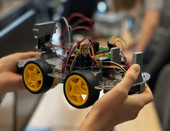 Den Roboter autonom fahren lassen und mit Hilfe eines Abstandssensors in einem definierten Abstand vor einem Hindernis stehen bleiben, war nur eine der Aufgaben bei den Praxistagen 2021. Von Mittwoch bis Freitag tüftelten insgesamt vier Team an den Roboter-Autos, die in diesem Jahr erstmalig Teil der Praxistage waren.