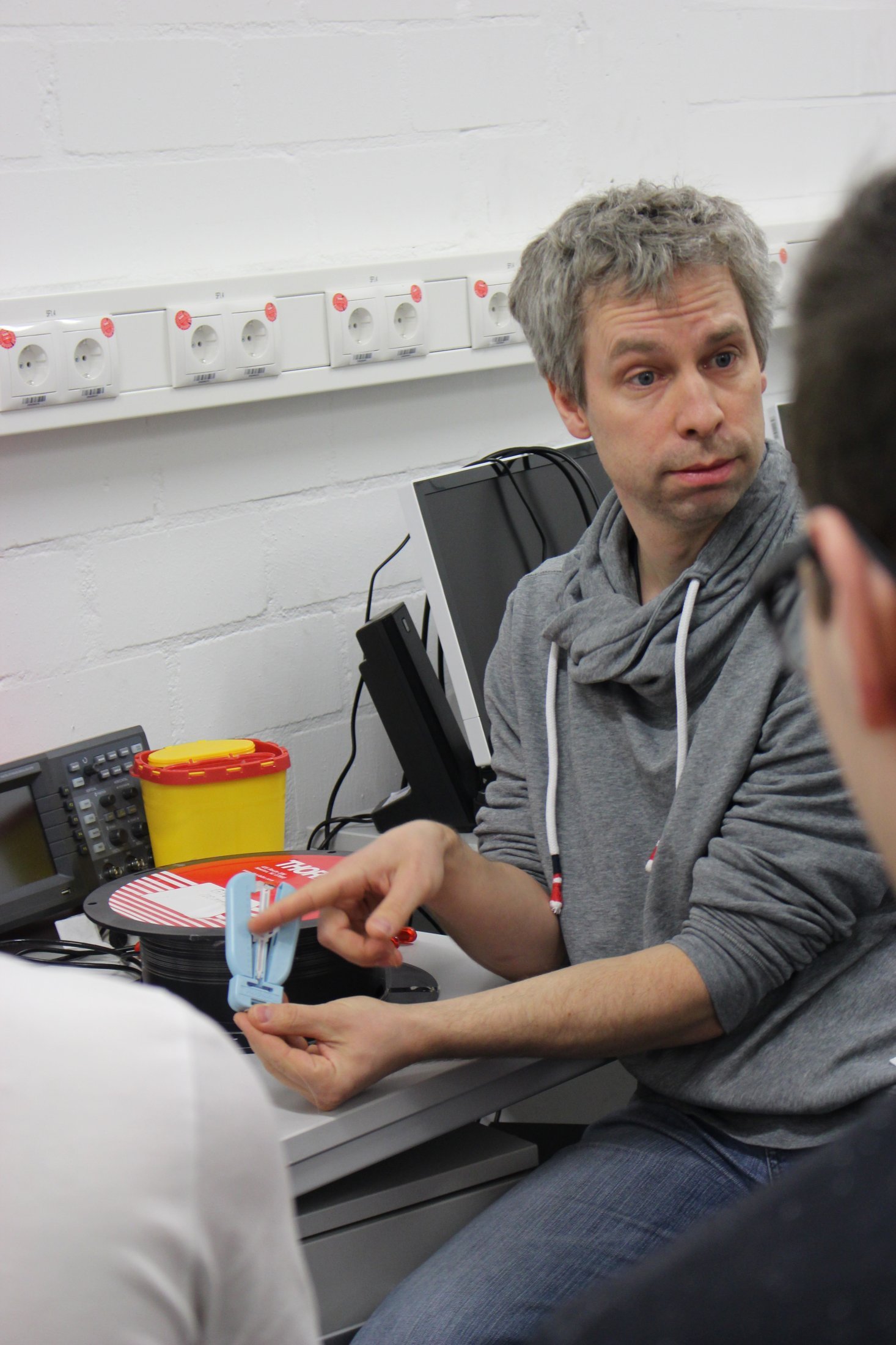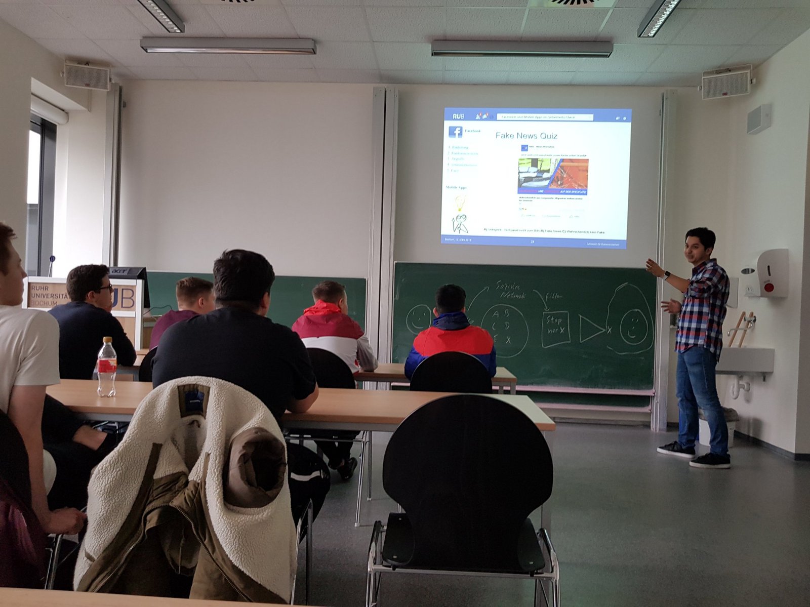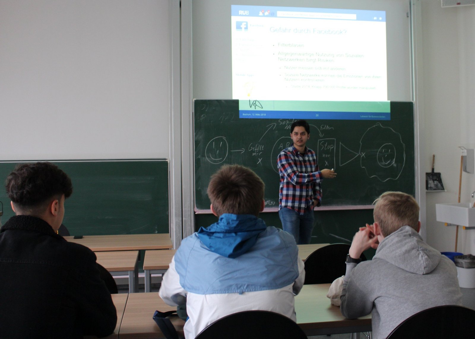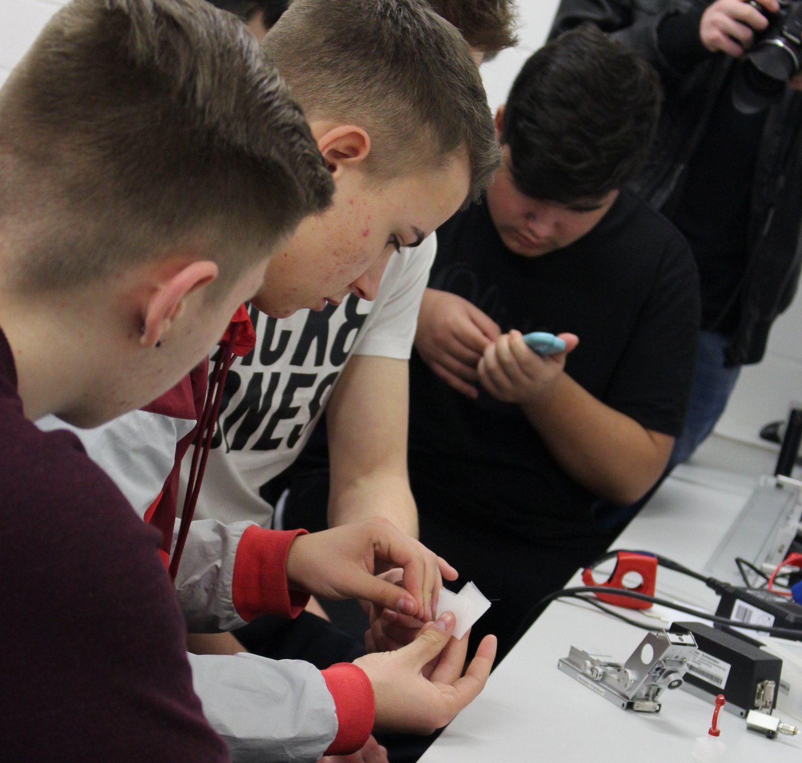 Seit 9 Uhr tüfteln sieben der jungen Leute zusammen mit Workshopleiter Carsten Brenner an filigranen Glasfaserkabeln und Lasern im ICN-Gebäude der Ruhr-Universität Bochum. Das Projekt zeigt den Teilnehmer/innen wie die Nachrichtenübertragung mit Licht über eine solche Faser genau funktioniert. Dabei bauen die Schülerinnen und Schüler das Modell einer Übertragungsstrecke auf und testen es. Über einen Halbleiterlaser und ein Glasfaserstück senden sie Tonsignale. Gleichzeitig klärt Workshopleiter Dennis Tatang die restlichen sechs Schüler über die Datensicherheit im Netz auf und veranschaulicht, wie Facebook und Instagram unsere "Likes" nutzen, Inhalte filtert und für ihre Zwecke einsetzen. Vor allem eins wird schnell klar: Daten sind weder in sozialen Netzwerken noch beim Instant Messaging mit dem Smartphone wirklich sicher. 'Was ist eine Filterblase?' 'Und wofür braucht meine Taschenlampen-App den Zugriff auf Daten und Bilder?' sind nur einige der Fragen, die hier beantwortet werden. Die Workshops finden im Zuge der MINT-Projekttage statt. (Fotos: Zeitel)
