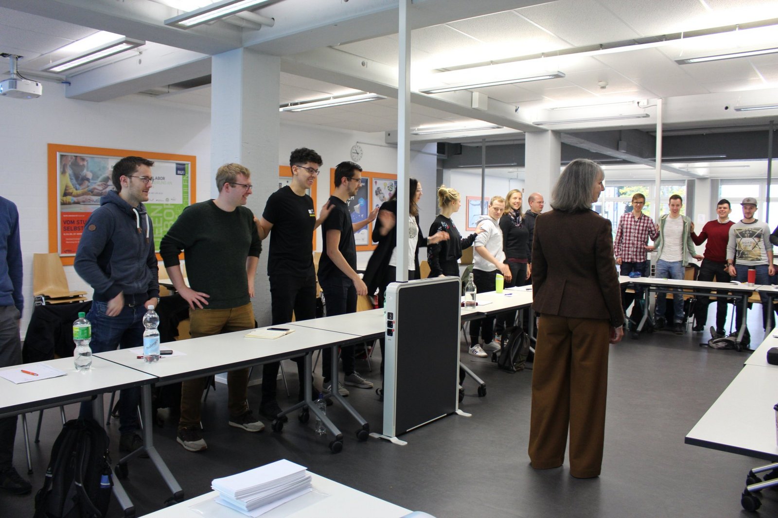 Rund 30 Studierende der RUB trafen sich dazu von 10 – 17 Uhr in den Räumlichkeiten des UFO, um sich einmal mehr bewusst zu machen, in welch kurzer Zeit ein erster Eindruck entsteht und wie man diesen positiv beeinflussen kann. Durch praktische Übungen in großer Runde als auch in kleineren Grüppchen, präsentierten sich die Teilnehmerinnen und Teilnehmer einander und konnten so Selbst- und Fremdwahrnehmung miteinander abgleichen. Über die reflektierte Entwicklung der eigenen Wirkung und entsprechenden Elevator Pitches für unterschiedlichste Gelegenheiten verbesserten sie ihr zielgruppengerechtes Auftreten und Handeln.