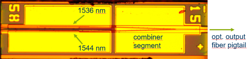 This laser features a Y-shaped resonator with a shared gain segment (combiner segment) and two separate gain segments for selective feedback at 1536 nm and 1544 nm with top-etched slots selecting a single mode from the available Fabry-Perot modes in the cavity. This allows oscillation of two distinct modes in the same cavity. Both modes can be tuned by adjusting the chip temperature and individually via the gain current in each segment, offering high spatial overlap, reduced inter-mode noise, and significant potential for on-chip integration. The laser chip is enclosed in a butterfly package, ensuring temperature control, mechanical protection, and stable coupling into a polarization-maintaining (PM) fiber. This laser features fast modulation performance while being limited in modulation bandwidth of the beating signal. In a single frequency CW-THz system, which is employing this laser as the beating source, measurement rates in the high kHz range of thin film thicknesses with micrometer precession can be achieved.