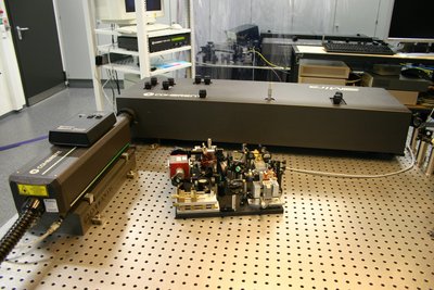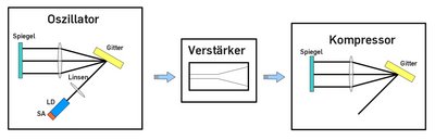 Dies erlaubt die direkte Verstärkung der Lichtpulse durch einen optischen Verstärker, welcher ebenfalls ein Halbleiterbauelement ist und elektrisch gepumpt wird. Anschließend wird der Puls durch einen Kompressor auf die Dauer einiger 100 fs komprimiert. Durch die Verwendung von Halbleiterlasern, lässt sich das gesamte System auf einer Grundfläche von 300 * 300 mm² aufbauen. In Abb. 2 ist das kompakte Femtosekunden-Diodenlasersystemn vor einem kommerziellen Ti:Saphir-Laser fotografiert. Sämtliche Komponenten zur Erzeugung hochenergetischer Lichtpulse sind vorhanden.