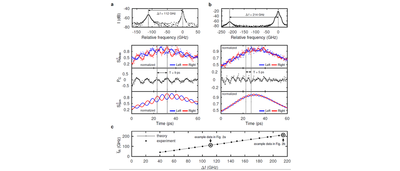 Zu Abbildung 3: Ultraschnelle Polarisationsdynamik im Spin-VCSEL für Modenaufspaltungen von 112 GHz (a) und 212 GHz (b). Die Spektren I zeigen die gemessene Modenaufspaltung. Die Zeitverläufe S±Meas stellen die gemessenen zirkularen Intensitäten dar, aus denen der zirkulare Polarisationsgrad PC bestimmt werden kann. Dieser weist jeweils eine Oszillation mit der durch die Modenaufspaltung vorgegebenen Frequenz auf. S±Sim zeigt mittels des generalisierten Spin-Flip-Modells berechnete Verläufe mit hervorragender Übereinstimmung zum Experiment. Die Frequenz f~R der Oszillation in PC, also die Resonanzfrequenz der Polarisationsdynamik, kann mittels der Modenaufspaltung eingestellt werden (c). Aus [11]: M. Lindemann, G. Xu, T. Pusch, R. Michalzik, M. R. Hofmann, I. Žutić und N. C. Gerhardt, Ultrafast spin-lasers, Nature 568, 212 (2019).
