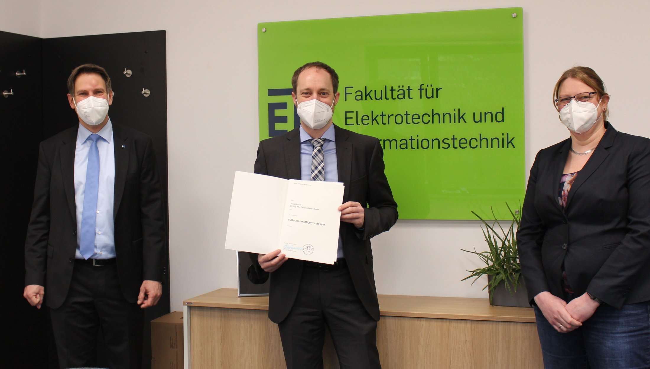 Überreicht wurde die Urkunde mit der Verleihung zum "apl. Prof." von Dekan Thomas Musch und Geschäftsführerin Corinna Heldt. Dr.-Ing. Nils Gerhardt ist am Lehrstuhl für Photonik und Terahertztechnologie von Martin Hofmann tätig. Die Fakultät gratuliert ganz herzlich zu dieser Auszeichnung.