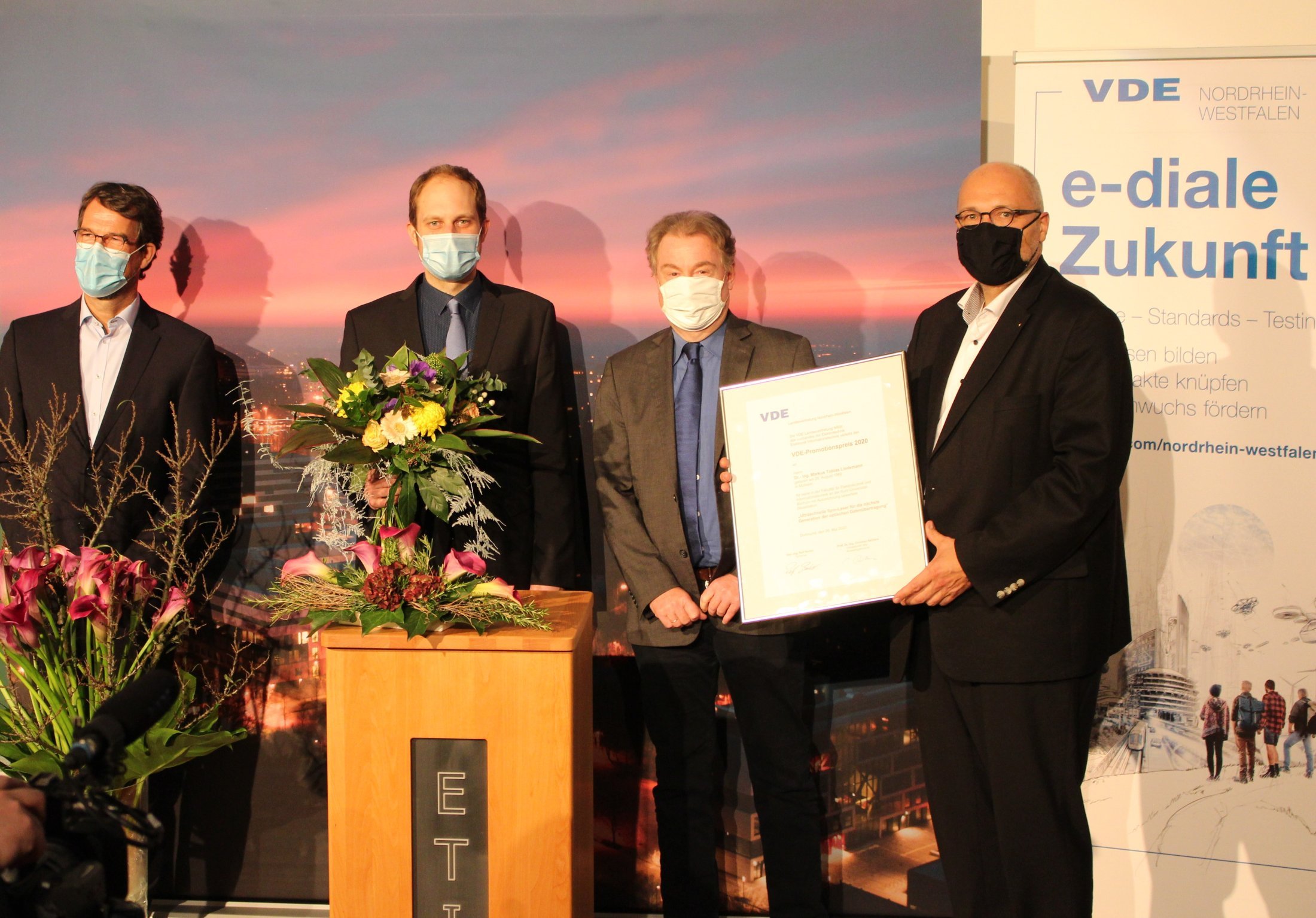 Um kurz vor 18 Uhr war es dann endlich soweit: Dr.-Ing. Ralf Berker, Sprecher der VDE Landesvertretung NRW und Prof. Dr.-Ing. Christian Rehtanz, Vorsitzender des Promotionsausschusses der VDE LV NRW, überreichten feierlich den VDE Promotionspreis 2020 an Markus Lindemann. Dieser stellte im Folgenden seine Dissertation vor und stand abschließend allen Teilnehmern vor Ort und per Zoom für Fragen bereit. Auch die Fakultät gratuliert Herrn Lindemann ganz herzlich zu dieser Auszeichnung.