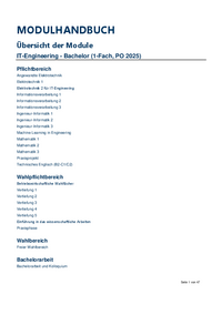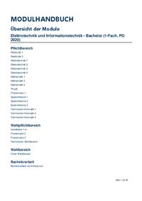 MODULHANDBUCH Übersicht der Module Elektrotechnik und Informationstechnik - Bachelor (1-Fach, PO 2020) Pflichtbereich Elektronik 1 Elektronik 2 Elektrotechnik 1 Elektrotechnik 2 Elektrotechnik 3…